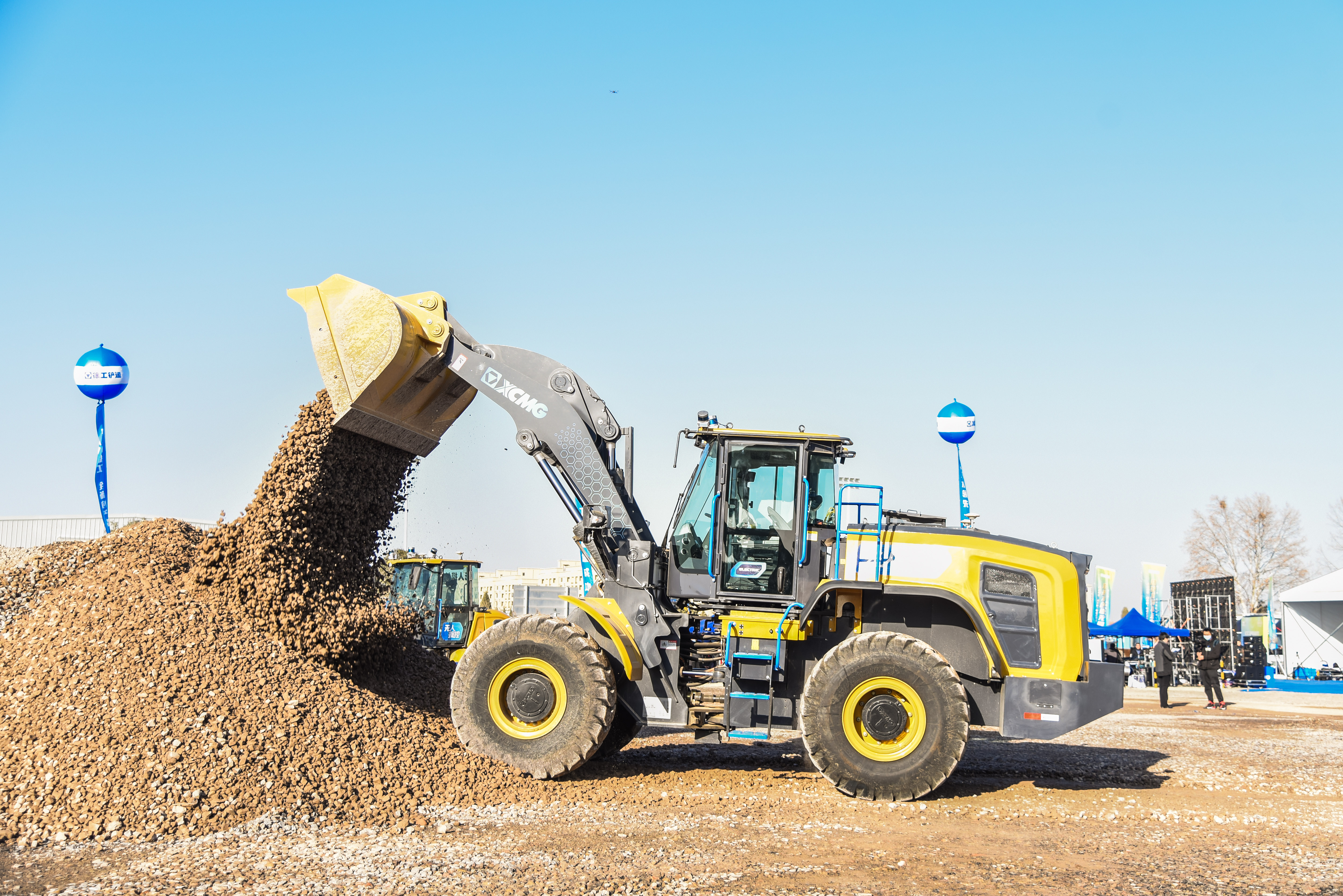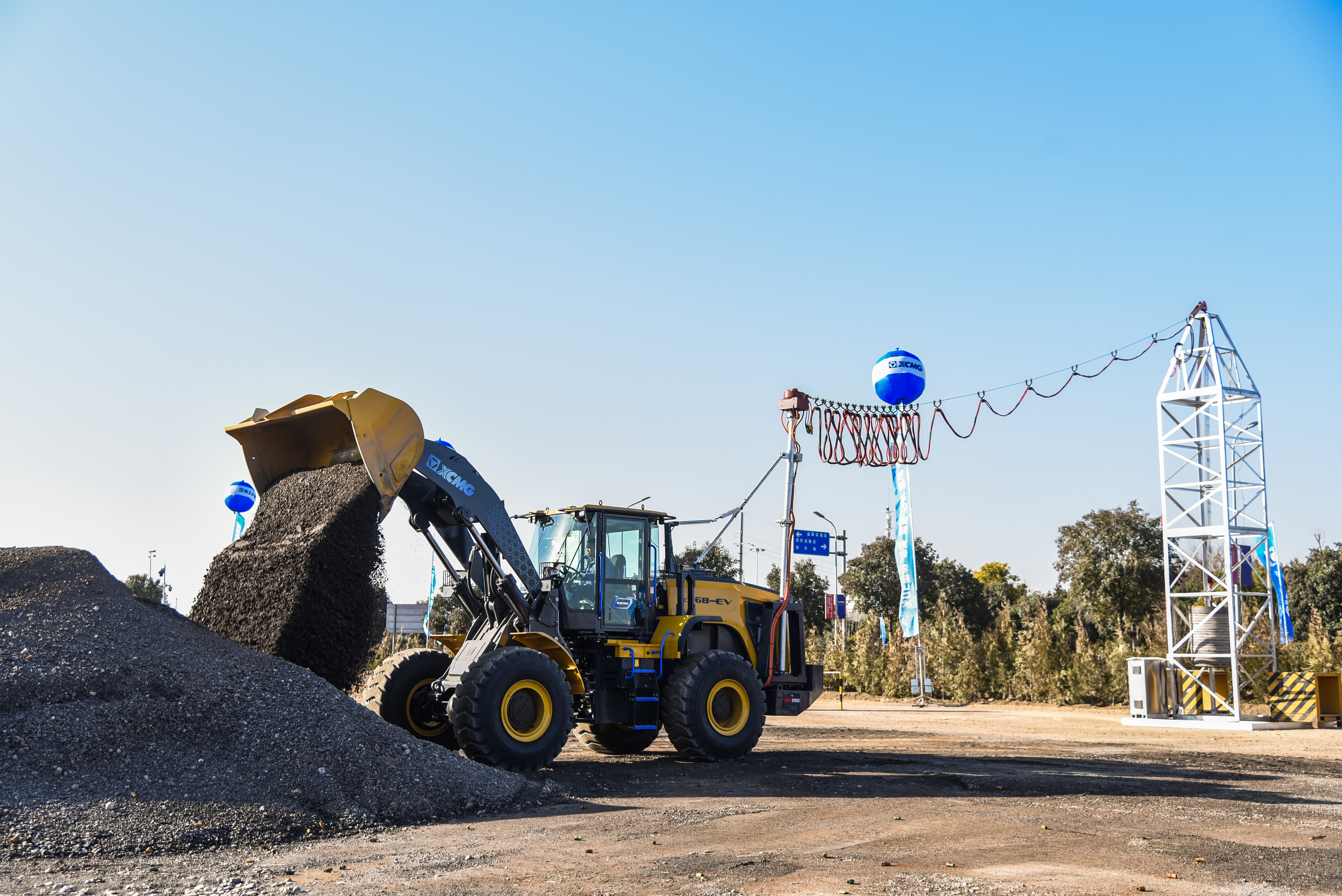 现场,中国第一、全球前三的神州第一铲——徐工XC9350超大吨位电传动装载机实际铲装;徐工拖线式装载机利用电网供电,满足24小时零排放连续作业,50米范围内可以360°旋转无障碍施工;同时,徐工“无人双子星”XC918-EV和XC968-EV,绿色化与智能化的集大成者,全球首次将无人化与电动化前沿科技相结合,完全实现装载机铲装运卸连续化全无人自主作业,代表行业最高技术水平。