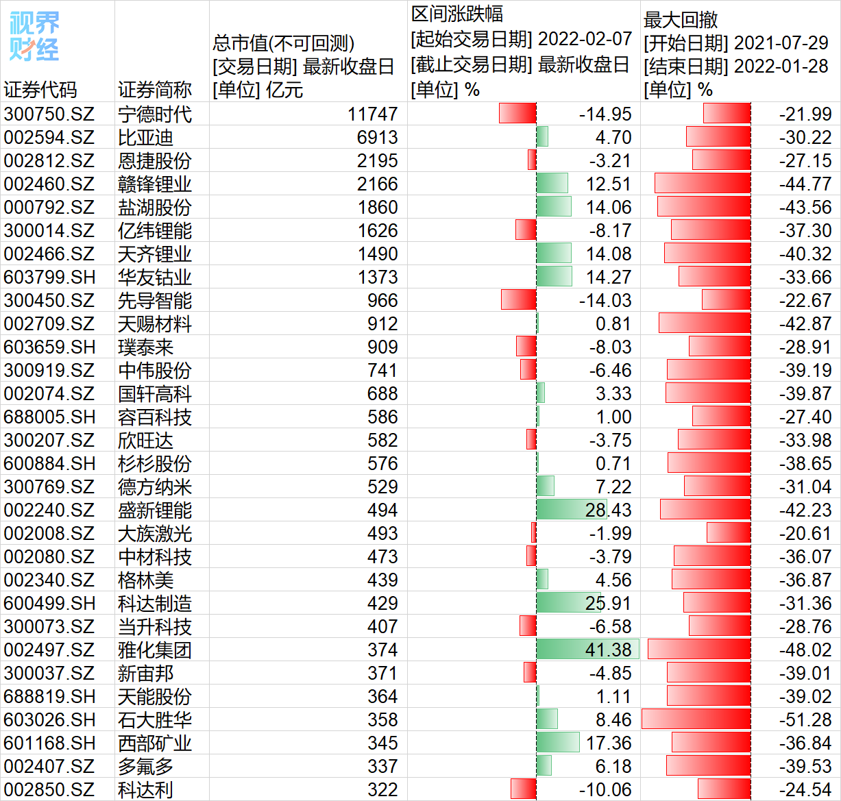 首先,或许是“补跌”的因素。春节之前几个月,锂电池概念股大都经历了大幅回撤,平均(中位数)回撤37%,石大胜华、西藏矿业、永太科技等股票短短数月最大回撤幅度甚至超过50%,反观宁德时代,最大回撤仅21.99%,仅次于大族激光位列第二。彼时抗跌,此时补跌。