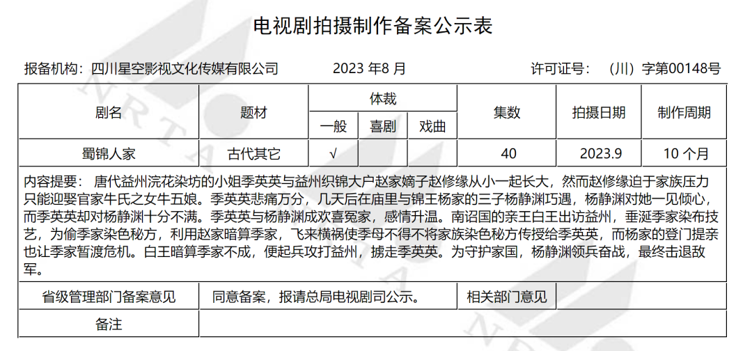 极具地方特色的《蜀锦人家》筹备三年,终于由四川星空影视重新备案。《三叉戟》导演刘海波、《司藤》编剧汪洪加盟,谭松韵、郑业成主演,9月12日刚刚在贵州开机。这部剧中,非遗“蜀锦”将作为亮点穿插在爱情叙事中,原作者桩桩本就是四川人。天地祺祥教育同时备案了她的另一部作品《易轻尘》(《一怒成仙》)。