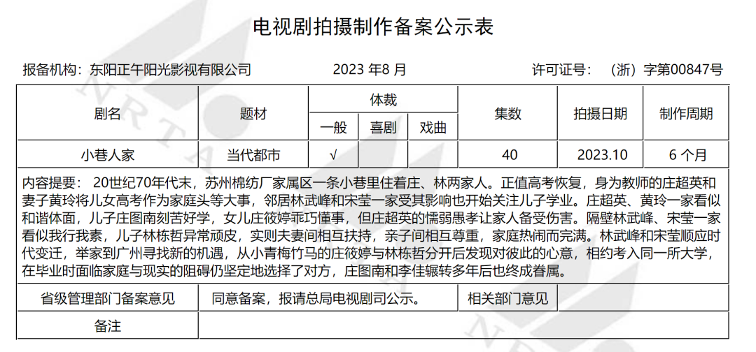 家庭情感也在正午阳光的舒适区。正午阳光备案了年代家庭剧《小巷人家》,改编自大米同名小说,以上世纪七十年代末为背景,讲述苏州棉纺厂家属区一条小巷里庄、林两家人的故事。