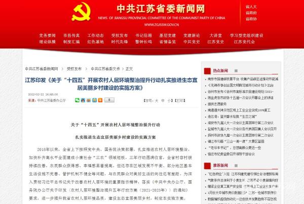 改善农村人居环境是事关广大农民群众福祉的民生工程。近日,江苏省委办公厅、省政府办公厅印发《实施方案》,提出“十四五”期间建设生态宜居美丽乡村的目标任务和政策举措,持续改善提升江苏省农村人居环境质量。