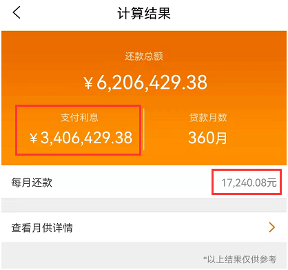 房贷利率6.25%,支付利息总额340.642938万元,每月还款17240.08元