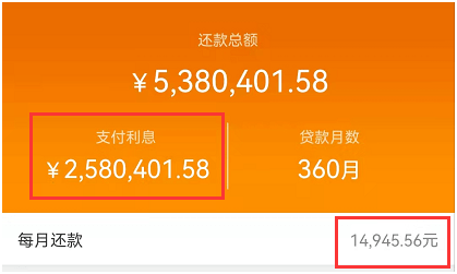 房贷利率4.95%,支付利息总额258.040158万元,每月还款14945.56元