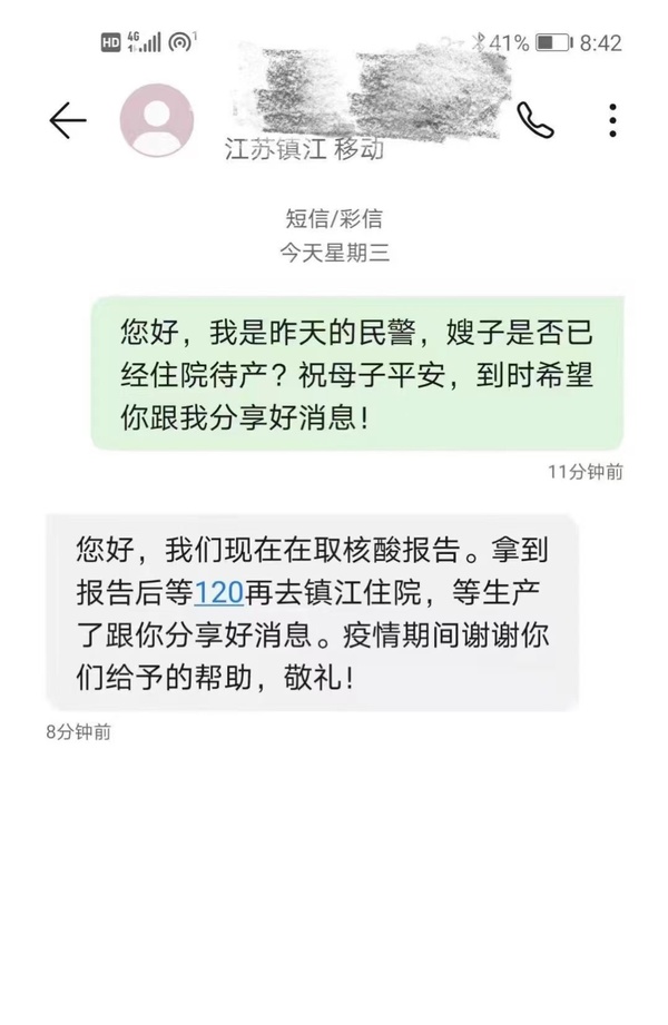 放心不下的民警,4月7日还特地微信给报警男子,询问其妻的生产情况。报警男子告知民警他们在等核酸报告,然后就要去镇江住院。“等生产了跟你分享好消息。疫情期间谢谢你们给予的帮助,致敬!”
