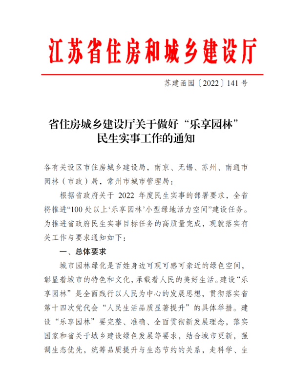 近日,江苏省住房城乡建设厅下发《关于做好“乐享园林”民生实事工作的通知》,进一步明确乐享园林活力空间建设要求,通知指出在单类单个项目的基础上,鼓励各地结合城市更新和片区建设,与老旧住区改造、社区微更新、基础设施建设、环境综合整治、生态空间修复、低效产业用地提升等推进多类、多个项目的统筹建设,强化与城市其他功能空间的衔接和复合利用,注重功能织补和特色彰显,构建生态效益、景观效果、服务功能显著的“乐享园林”体系。