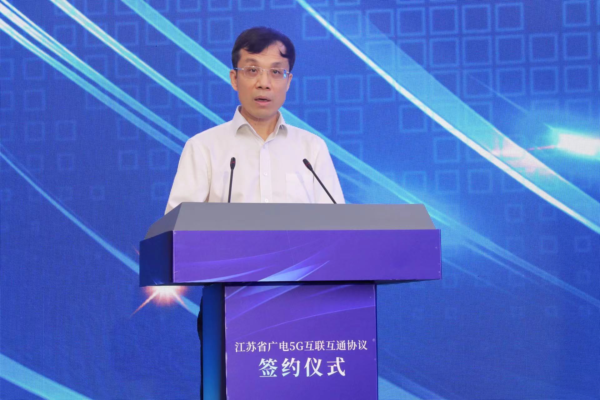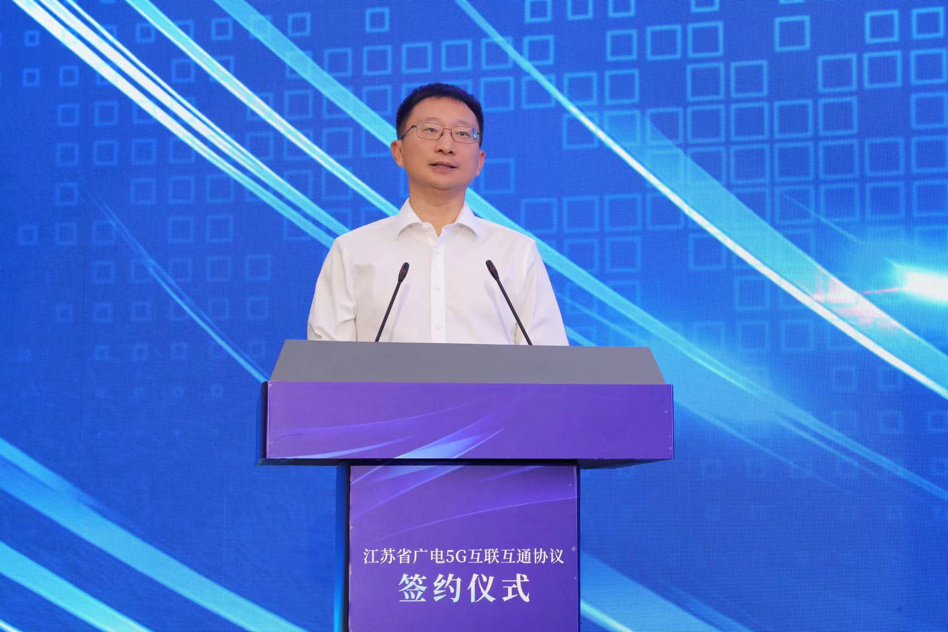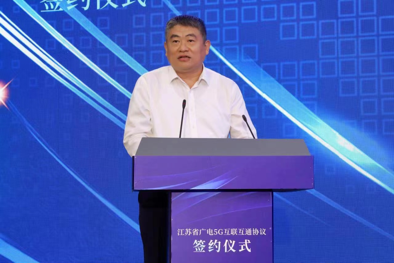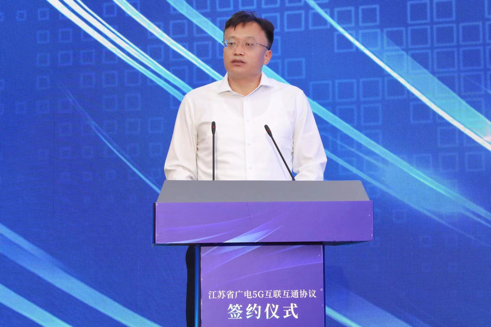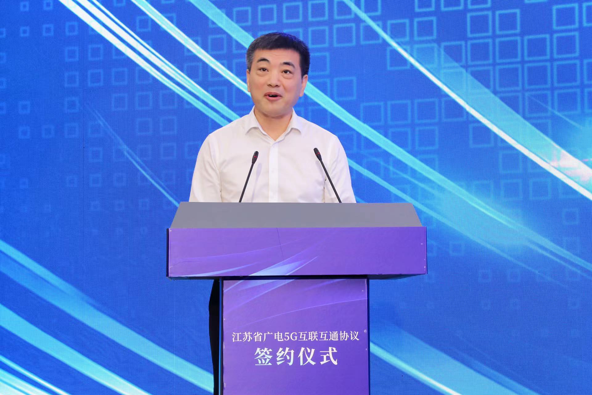胡广杰在致辞中指出,中广电移动江苏分公司与电信、移动、联通三大运营商江苏省公司签署网间互联协议,围绕5G开展深入合作,谋求互利共赢,这是江苏大力推进数字信息基础设施建设的重要代表成果,也是加快推动全省数字经济高质量发展的重要战略举措。