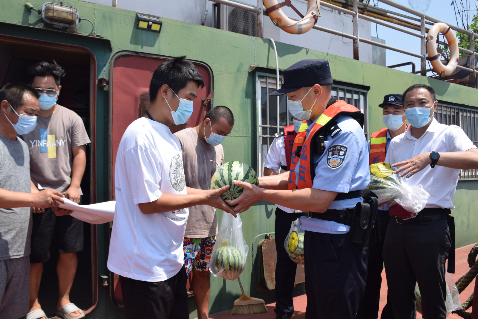 活动中,执法人员登上停泊在锚地的“新宜祥乐”“江润同舟”等船舶,将矿泉水和西瓜送到船民手中,送上清凉与关怀,同时与船民亲切交谈,询问船民工作和生活方面存在的问题,进一步拉近与船民之间的距离,与船民共同庆祝第18个中国航海日的到来。