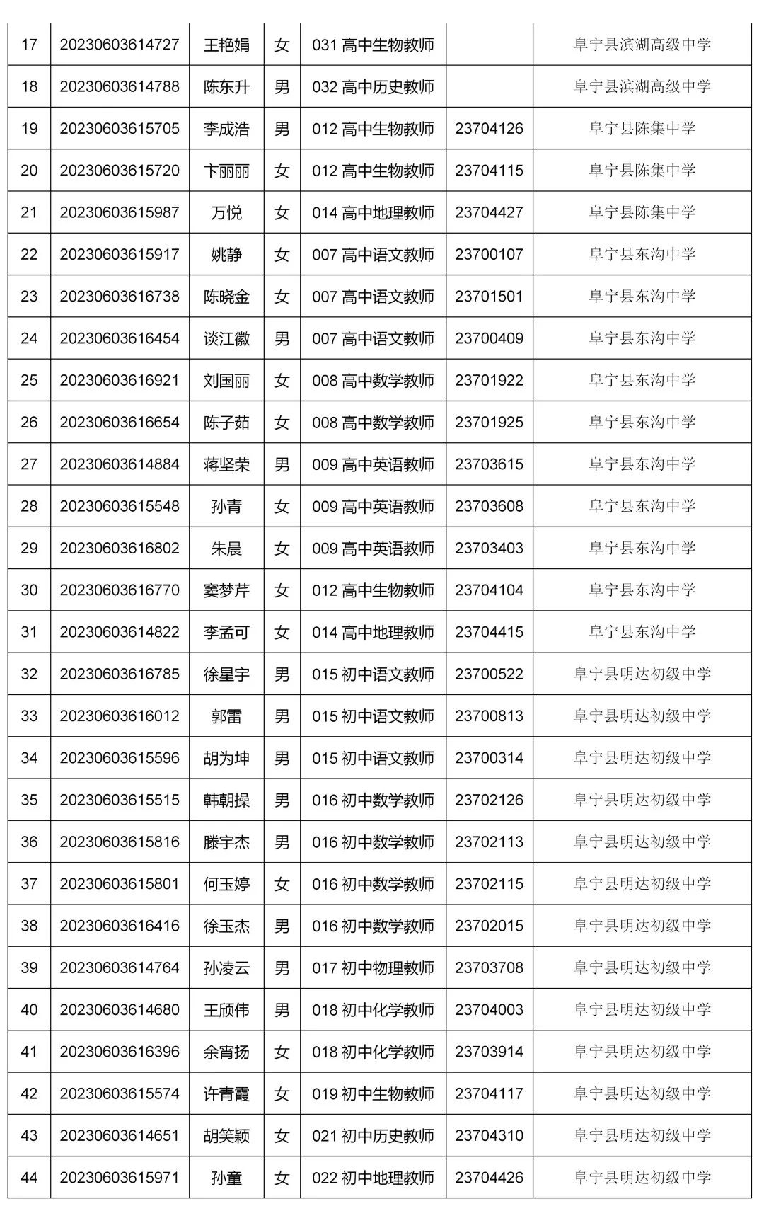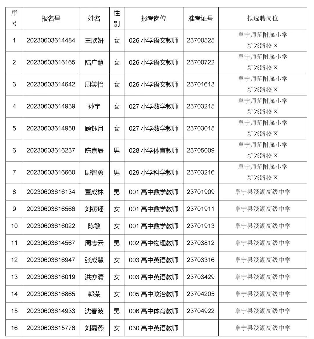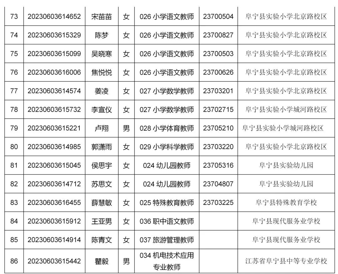 阜宁县教育局2023年公开招聘教师拟聘用人员名单公示