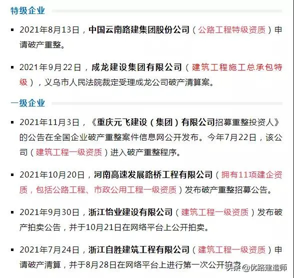 仅仅从2021年下半年到现在这半年的时间,已经有3家特级资质建企和4家一级资质建企申请破产重组/清算了。