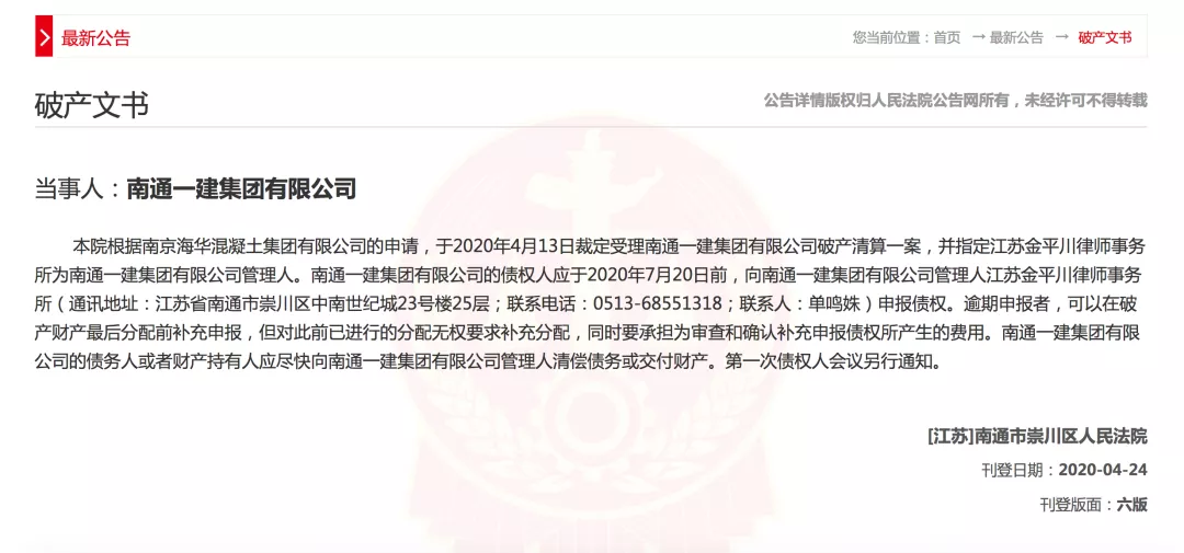 其中,南通一建于2020年破产清算。据人民法院公告网消息:南通市崇川区人民法院于2020年4月13日,裁定受理南通一建集团有限公司破产清算一案。
