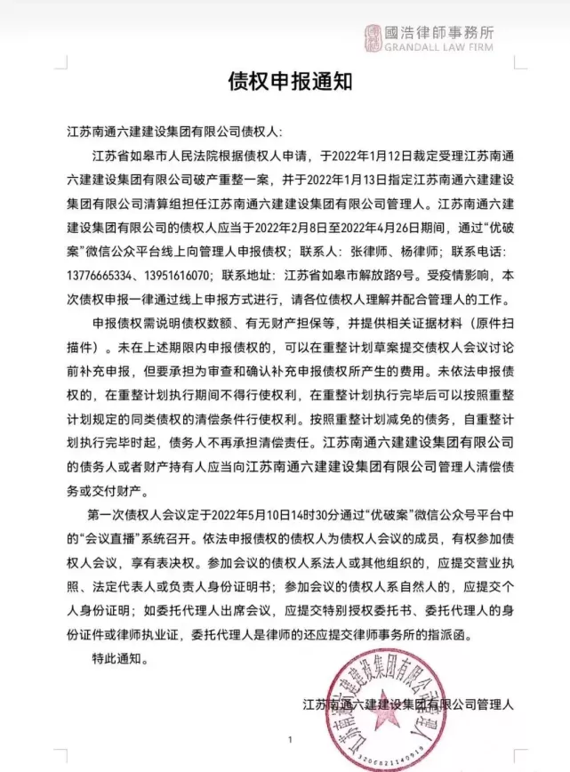 如皋法院公告显示,江苏南通六建建设集团有限公司的债权人应当于2月8日至4月26日期间,通过“优破案”微信公众平台线上向管理人申报债权。法院定于5月10日14时30分通过“优破案”会议直播方式召开第一次债权人会议。