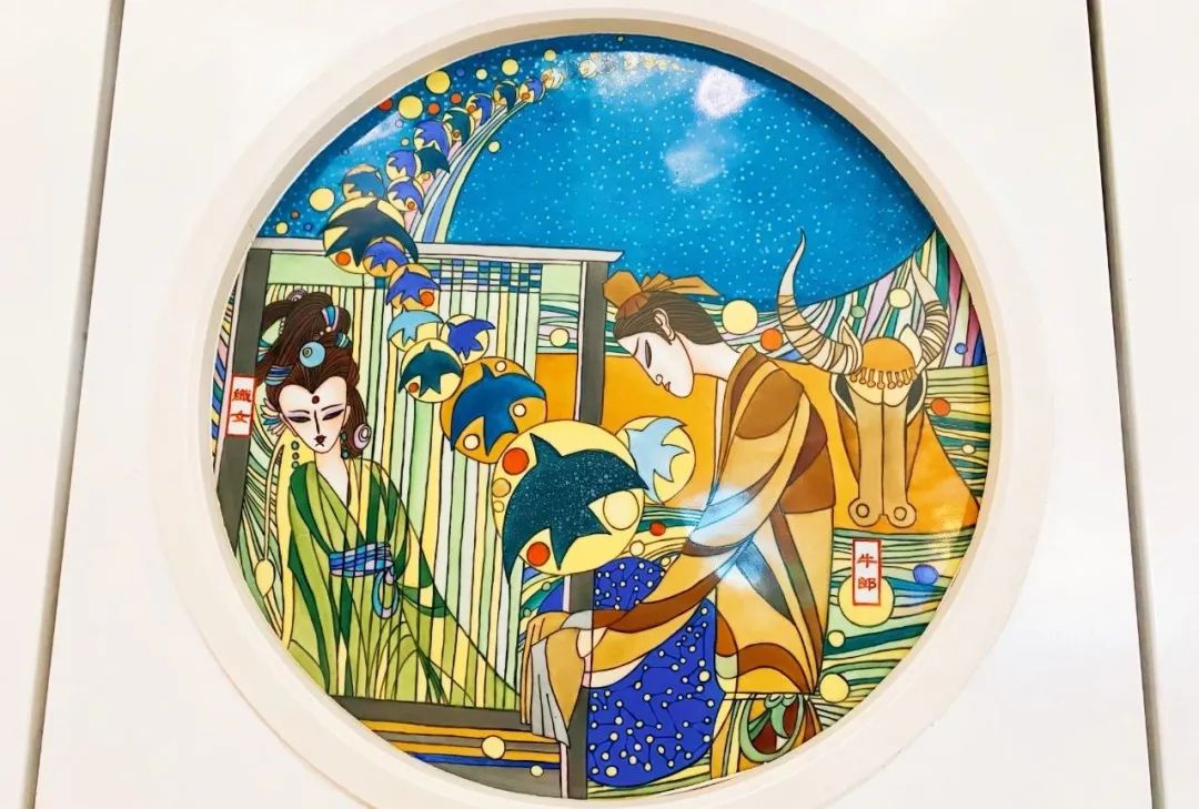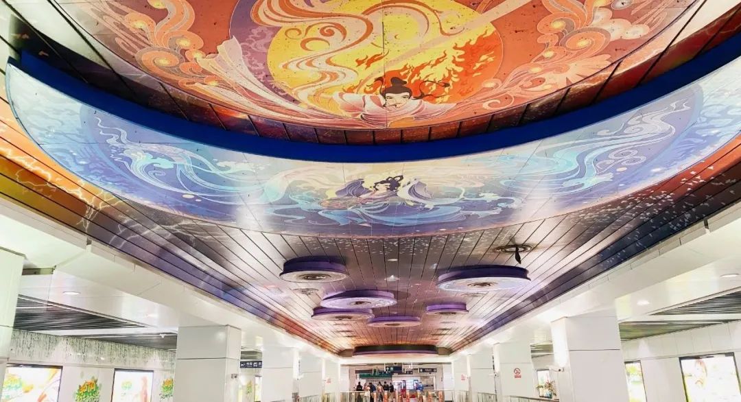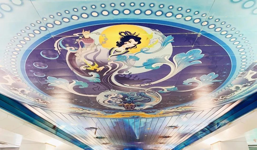 举目望去,顶部巨型壁画讲述着牛郎和织女的动人故事,蓝与紫梦幻交织。