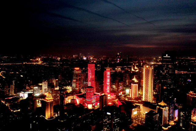 新街口、河西、百家湖等商圈灯火璀璨、光影交织。