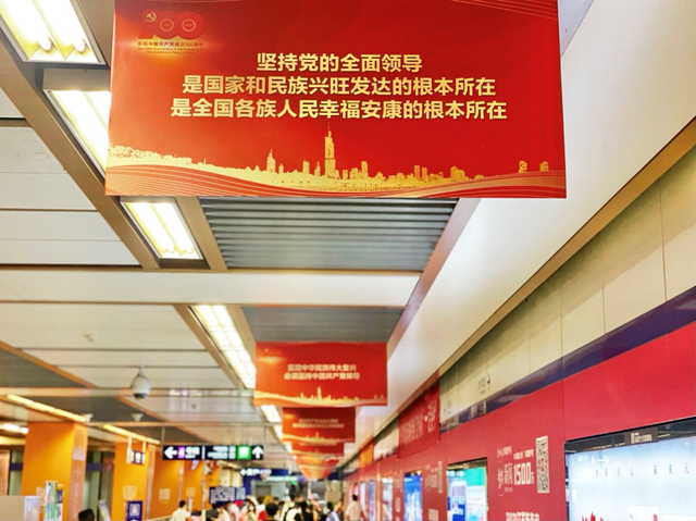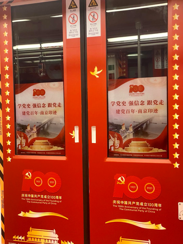 地铁车厢里被装饰成“庆祝中国共产党成立100周年”主题,以红色、橙色等暖色系为主基调,车门、拉手、车顶等多处都贴上建党百年相关海报。