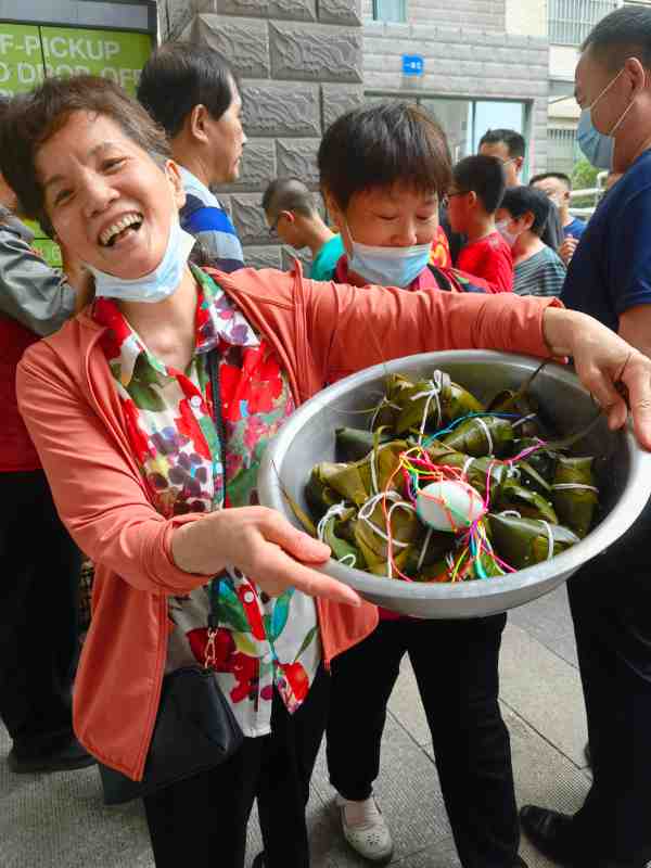 业主居民在社区文化活动中,开心地展示自己包的粽子